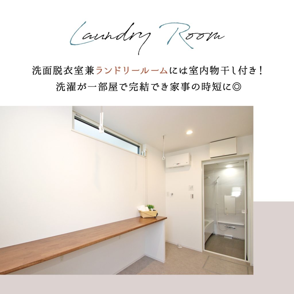 - ゆったりサイズの洗面脱衣室兼ランドリールームには室内物干し付き。洗濯が1部屋で完結します