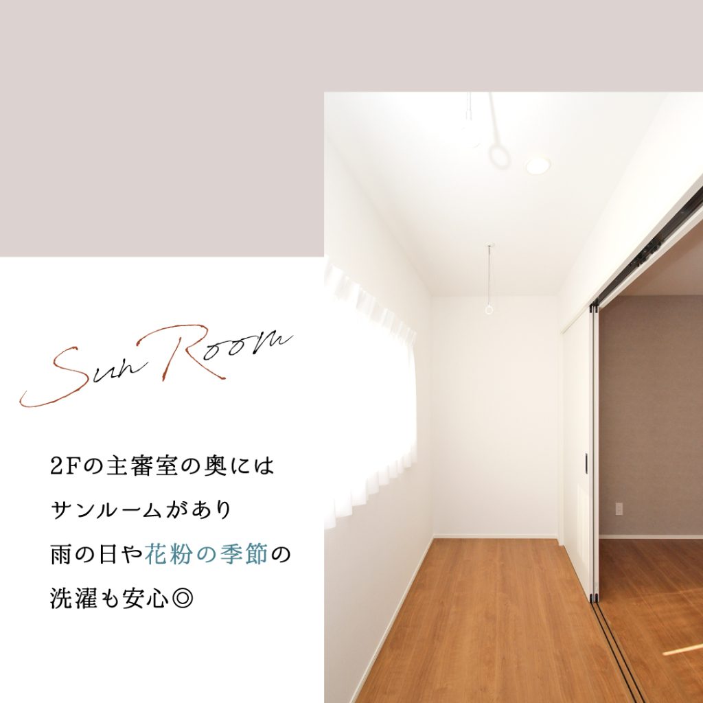 - 物干しスペース兼サンルーム付き。スライドドアを開ければ寝室と一体の空間に