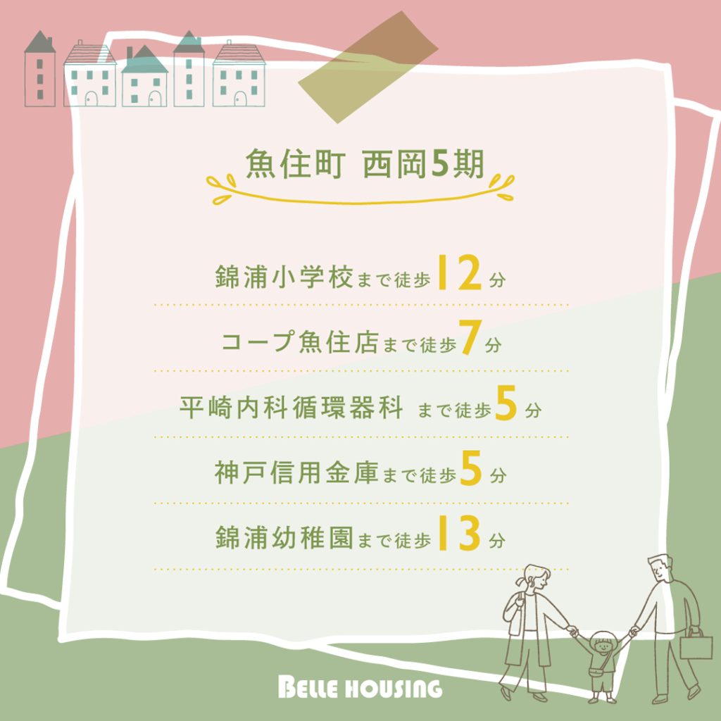 ●中尾保育所まで徒歩6分、錦浦幼稚園まで徒歩13分、錦浦小学校まで徒歩12分、魚住中学校まで徒歩18分。