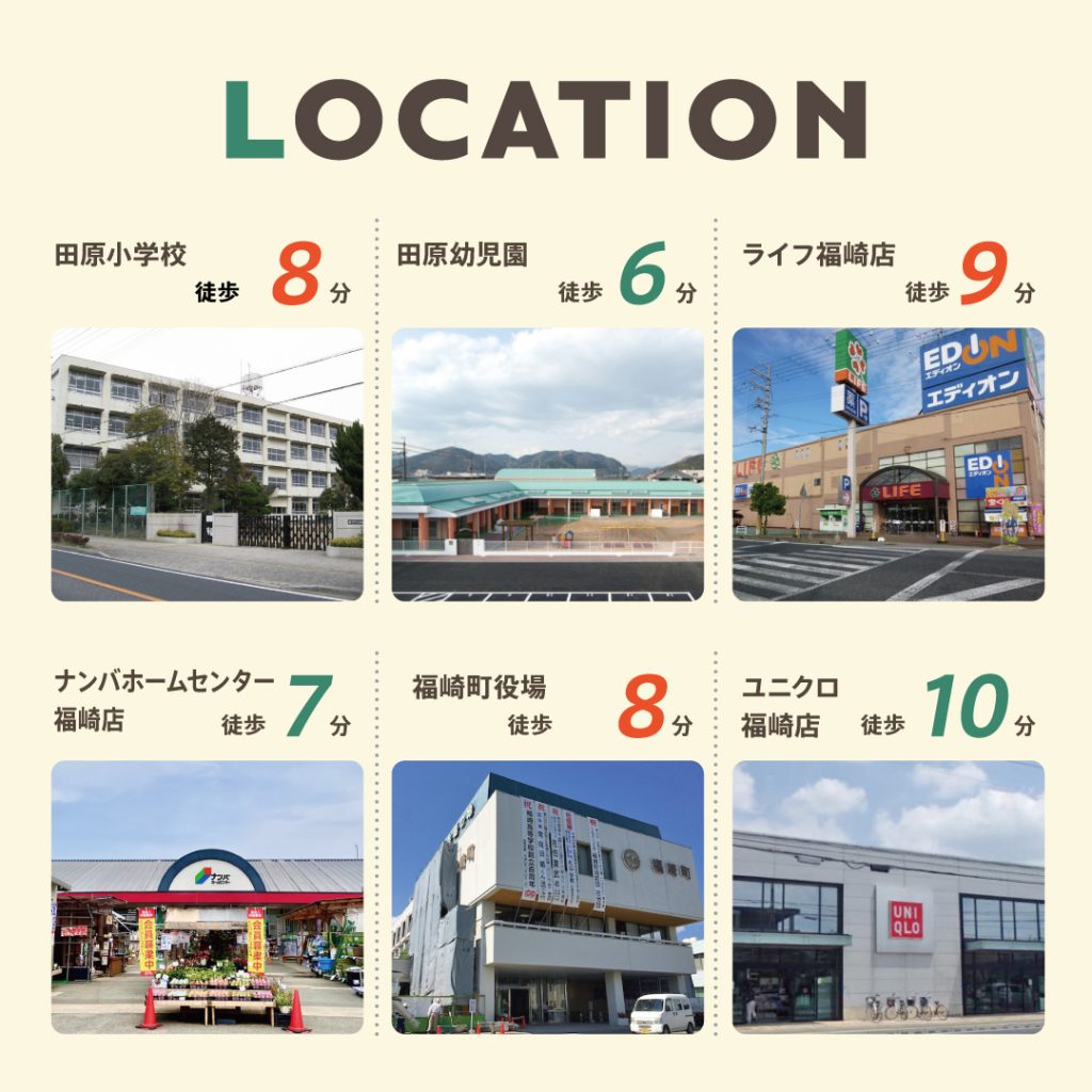 田原小学校まで徒歩8分、田原幼児園まで徒歩6分とお子様の通学も安心な立地ながら、近隣にはライフ徒歩6分、ナンバホームセンター徒歩7分、福崎町役場徒歩8分、ユニクロ11分、フレッシュバザール13分と生活施設が充実した住環境です。