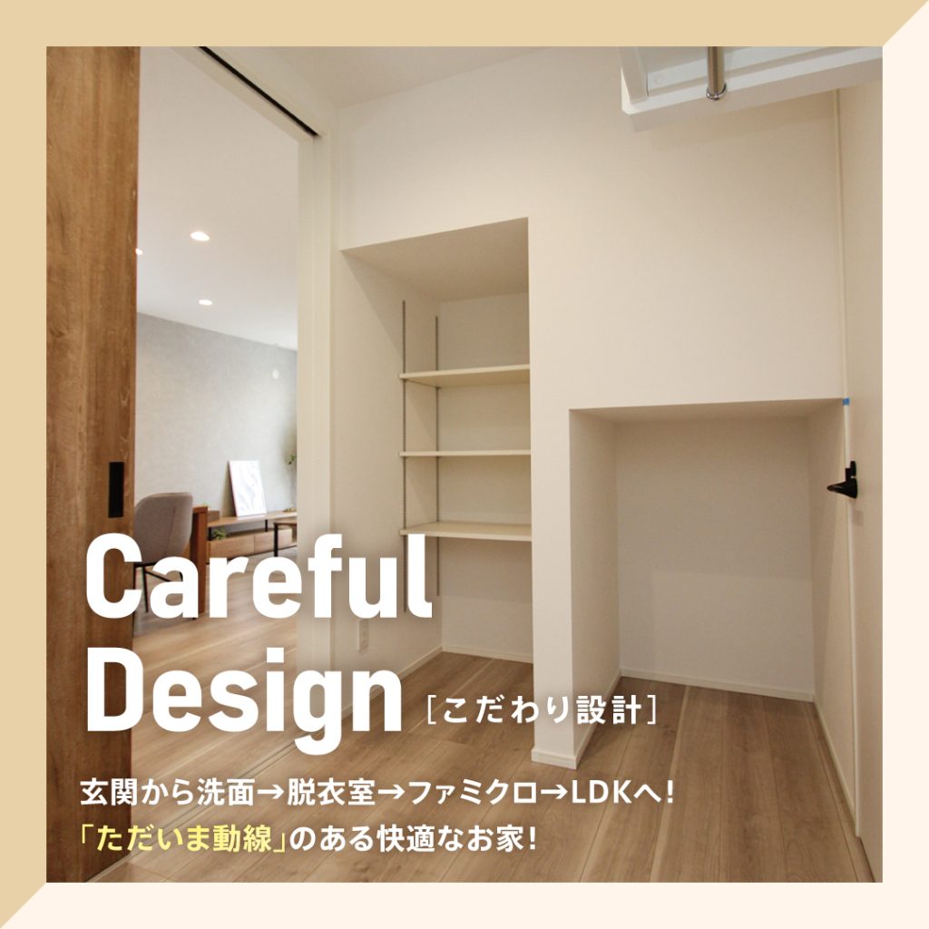 • 玄関から洗面→脱衣室→ファミクロ→LDKがつながる「ただいま動線」とキッチン→ファミクロ→水回り→ホール→LDKを回遊できる「家事動線」がどちらも◎