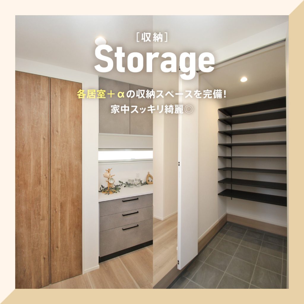 1階には大型ファミリークローゼットとシューズインクローク(土間収納)、2階にはウォークインクローゼットがある収納力抜群のお家。広いお庭には、3台並列駐車可能です。