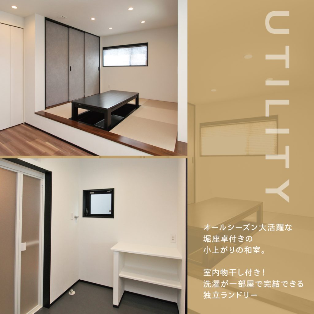 たっぷり干せる!室内物干し2本付きのランドリールーム、堀座卓の小上がり和室など憧れの空間や仕様がいっぱい。