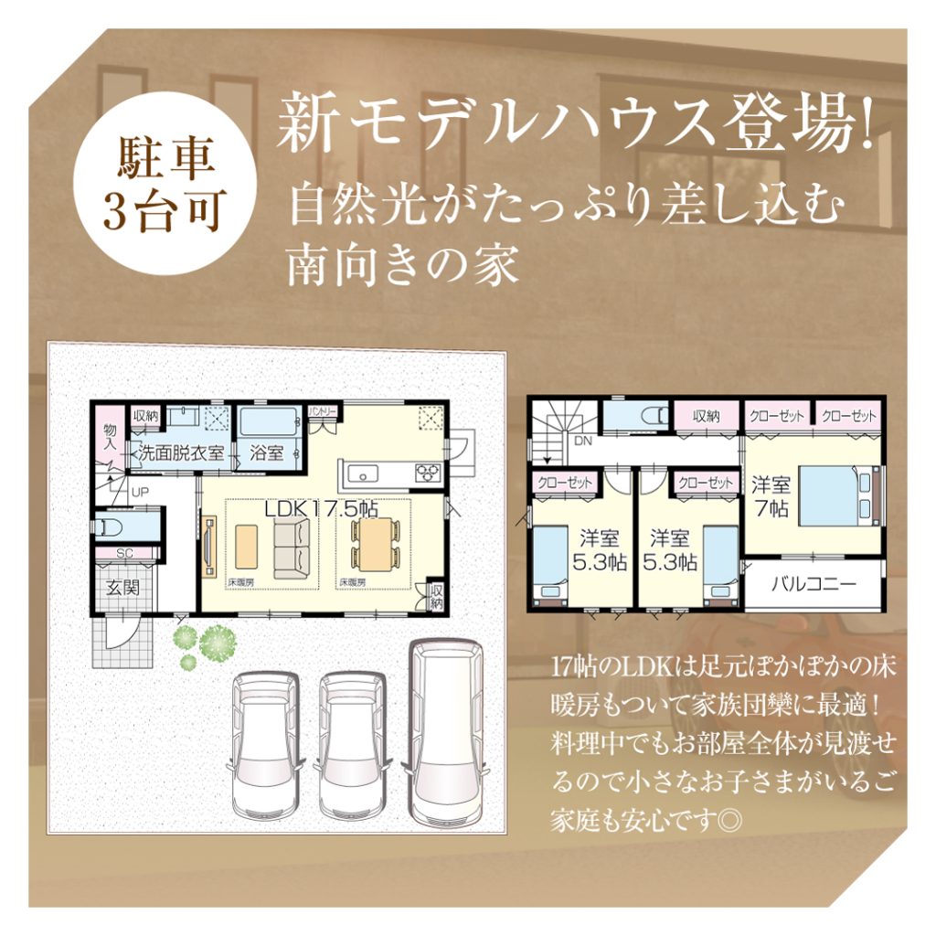 ★NEW OPEN!加古川市野口町「坂井3号地」モデルハウス見学会ご予約受付中!3,680万円(税込)、3LDK、建物面積94.39 ㎡ / 28.55 坪、土地面積147.19 ㎡ / 44.52 坪◆LDK床暖房◆並列3台駐車 ◆学校区/野口南小学校・中部中学校