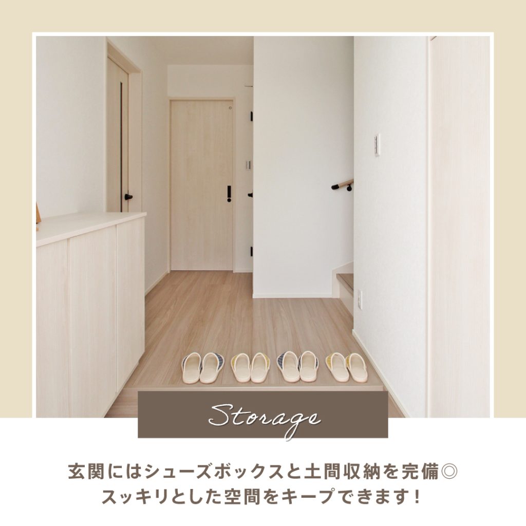 玄関の収納充実:シューズボックスと土間収納を完備し、スッキリとした空間を保てます。