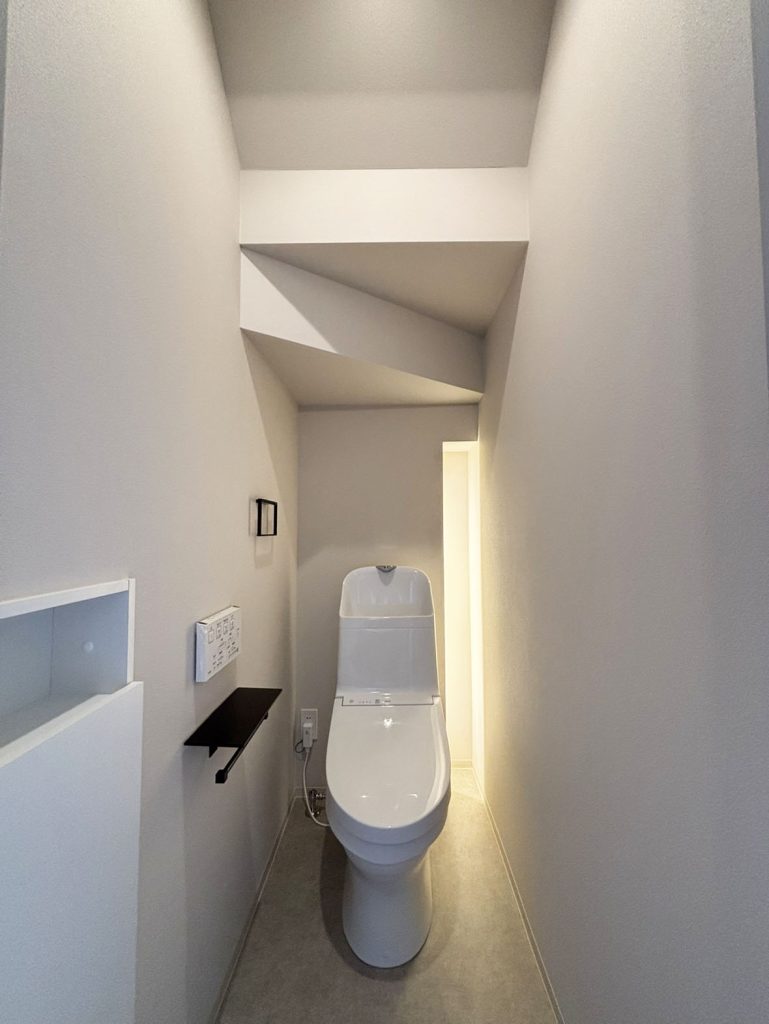 - 独立洗面には、照明、ワイドワイドカウンター、大型ボックスミラーなどがスタイリッシュな洗面化粧台を配置し、垂れ壁を配置することで奥行き感もプラス
