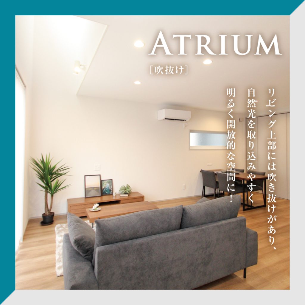 - リビング上部には吹き抜けがあり、自然光をたっぷり取り込んで明るく開放的な空間に。