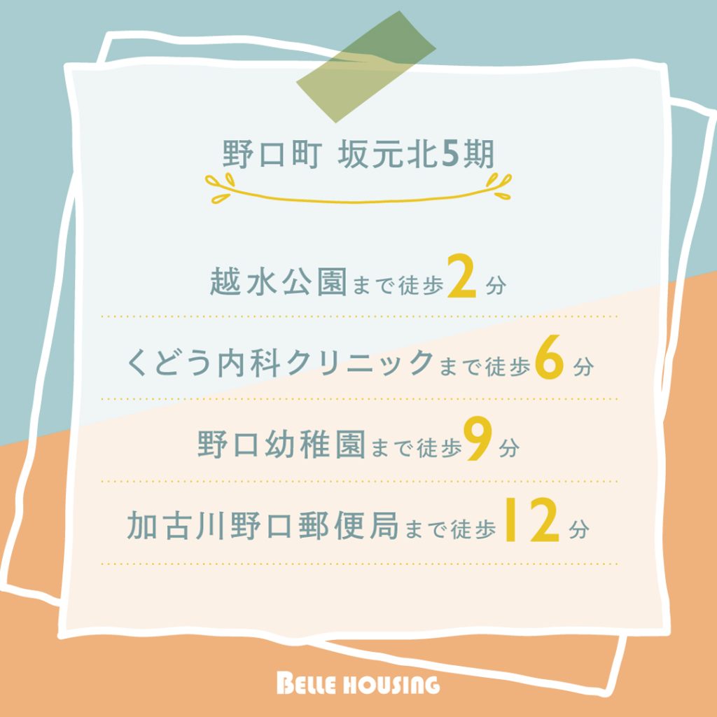 徒歩7分の野口小学校をはじめ、周囲には公園やスーパー、医療機関も揃い、
