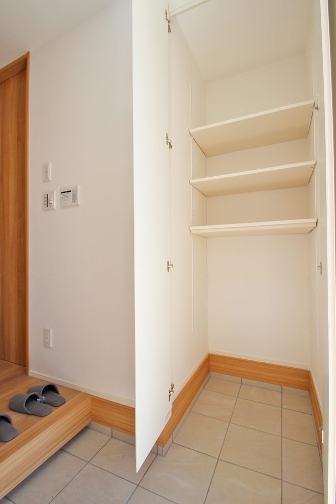 - 玄関はシューズボックスと土間収納のダブル収納で整理整頓がスムーズ。