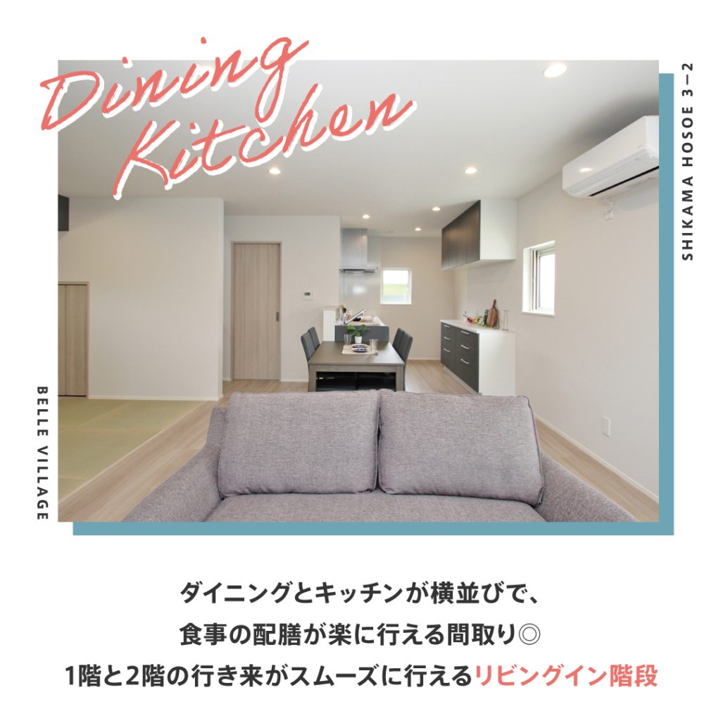 水回りがLDK内にあり、2階への移動もリビングイン階段を使えるので家事動線がスムーズです。 - 浴室乾燥機付きで、雨の日のお洗濯も安心。またバルコニーは雨が吹き込みにくいインナーバルコニータイプで外干しも◎