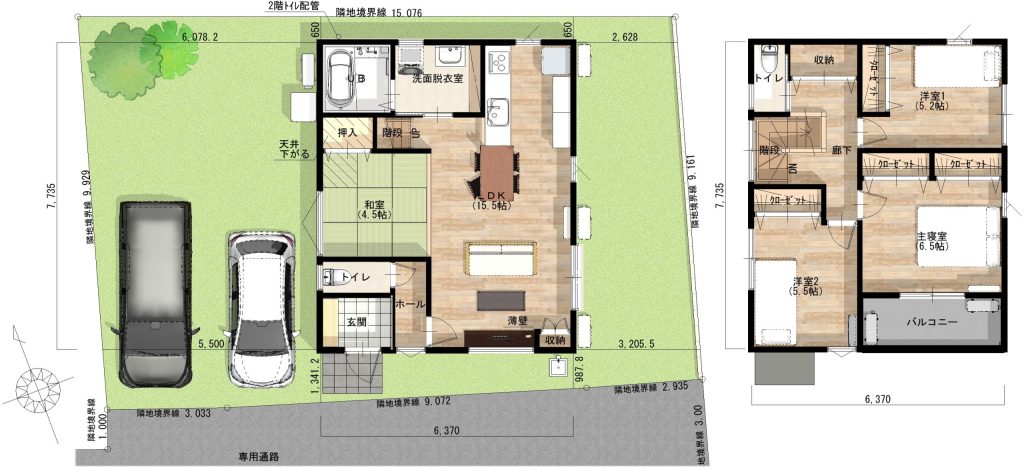 - 2台並列駐車をしてもまだまだゆとりの庭を確保。