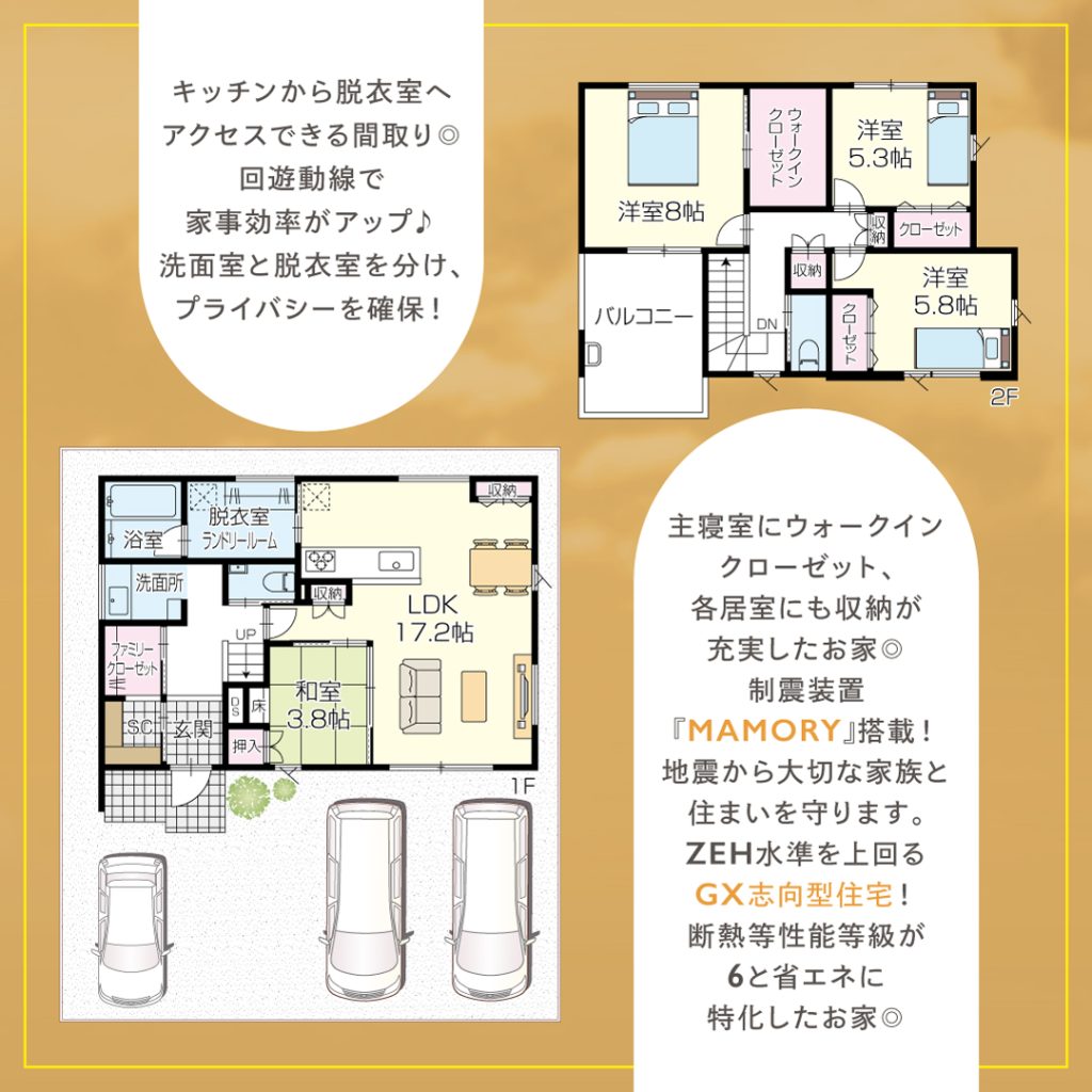 ★新モデルハウスOPEN・見学ご予約受付中!「北原7期15号地」:3,650万円(税込)4LDK、土地面積143.06 ㎡ / 43.28 坪、建物面積111.70 ㎡ / 33.79 坪 ◆制振装置『MAMORY』搭載◆GX志向型住宅(断熱等性能等級6)◆3台並列駐車◆ランドリールーム◆学校区:糸引小学校・灘中学校