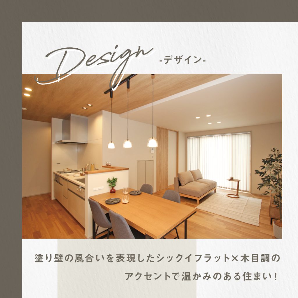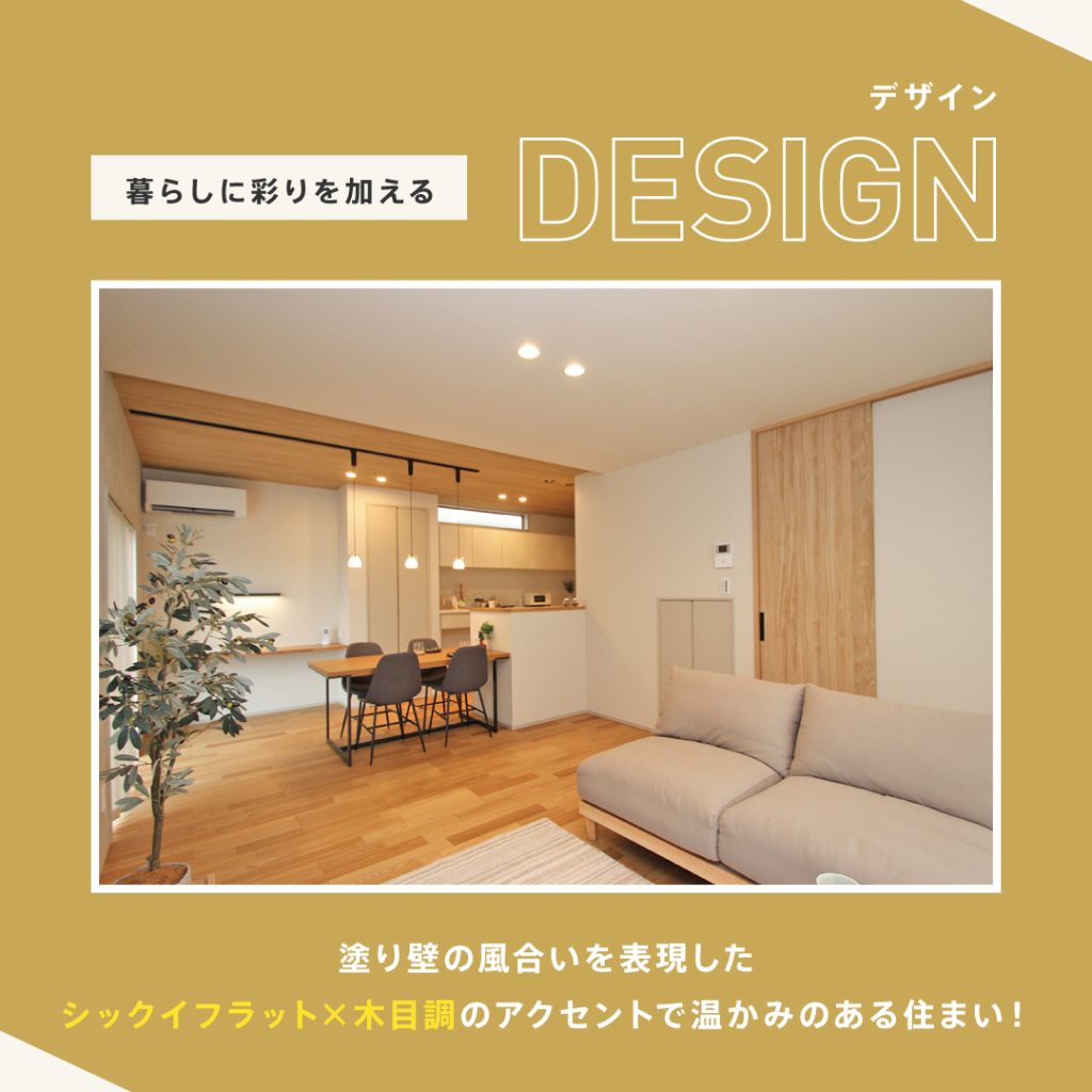 塗り壁調「シックイフラット」と木目調の天井・建具が調和した、やさしく心地よい内装。
