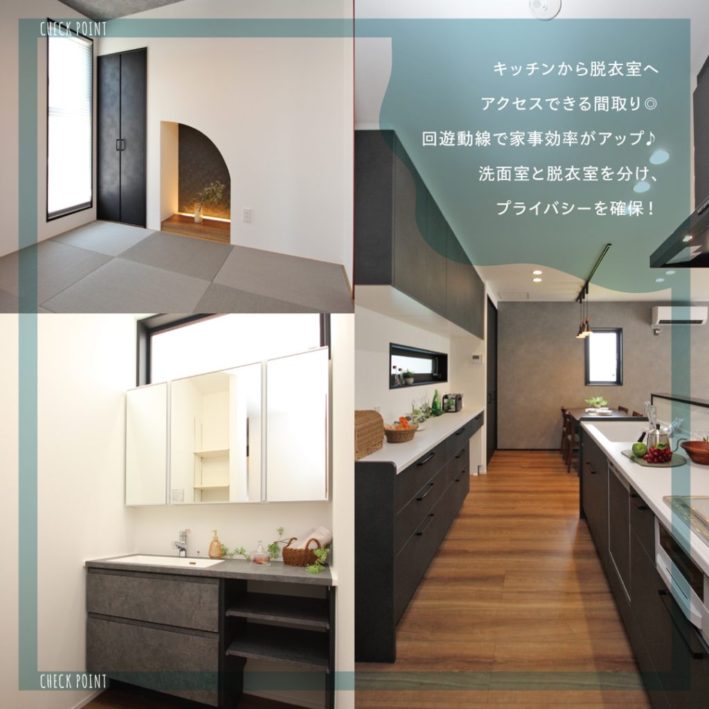 ●玄関→シューズクローゼット(土間収納)→ファミクロ→洗面がつながり、外出時の身支度や、帰宅時の着替え&手洗いがスムーズ