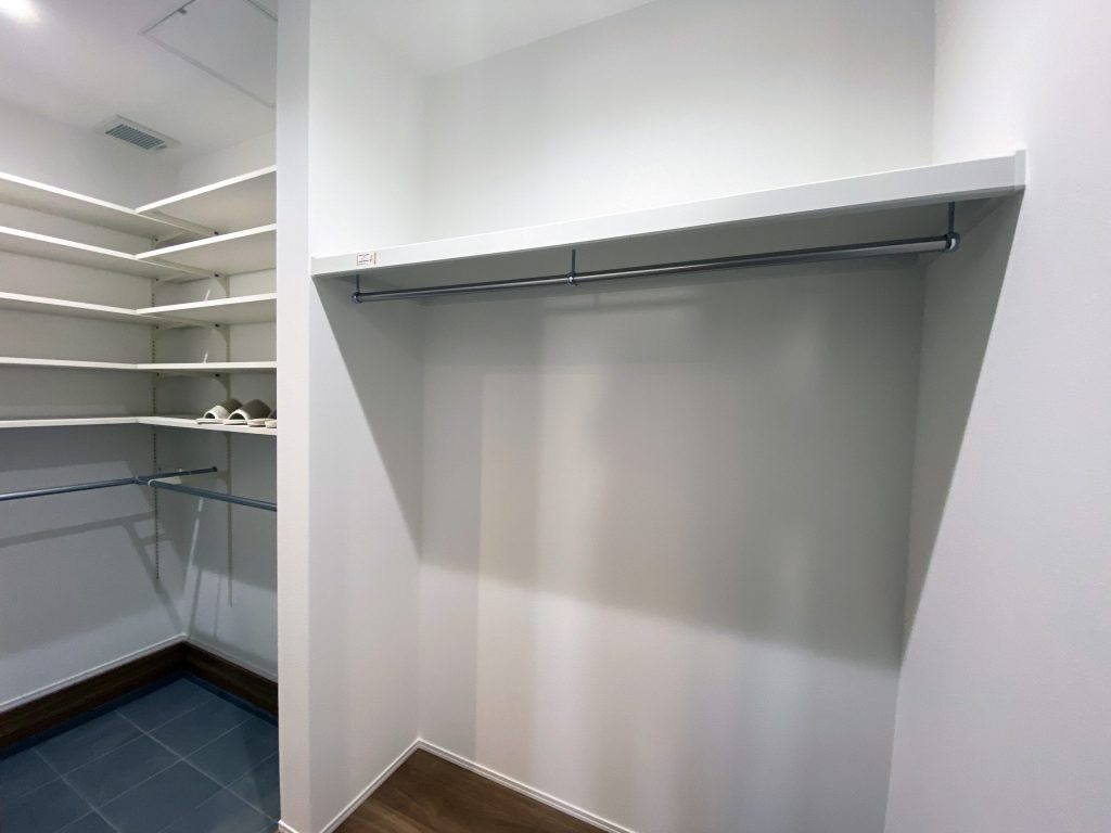 ●主寝室は納戸大のウォークインクローゼットを設置。大型収納充実、善居室収納付きに加えて、廊下にも物入があります。