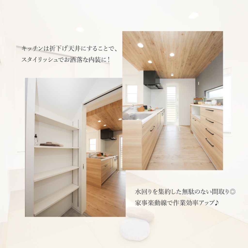 • キッチンと水回りが直通の使いやすい家事動線。洗面脱衣所は2WAYで回遊性があります。勝手口も付いてゴミ出し動線も◎
