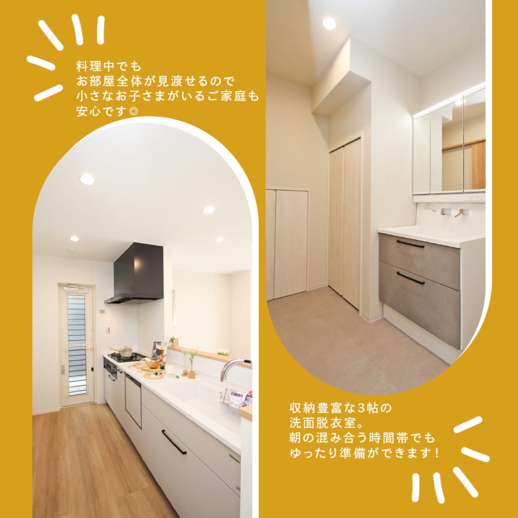 - 3帖の洗面脱衣室は大型収納付き。
