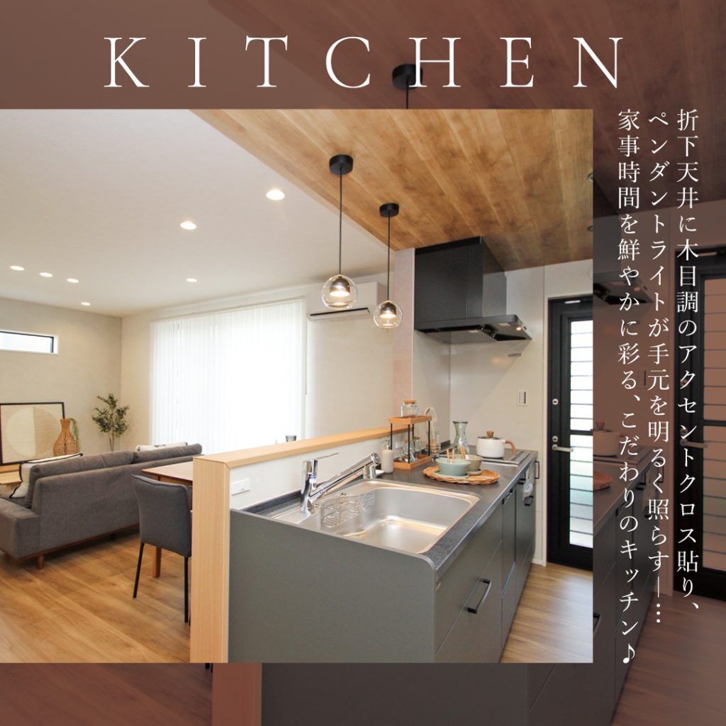 - 折下天井×木目アクセント+ペンダントライトが映える“見せるキッチン”。ネイキッドライトの建具&床材でナチュラルテイストの内装。