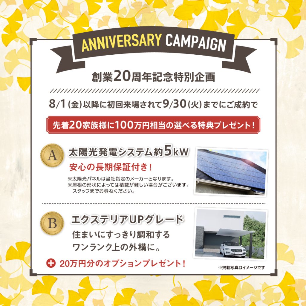 - 創業20周年 記念特典|先着20家族に“100万円相当”の選べる特典