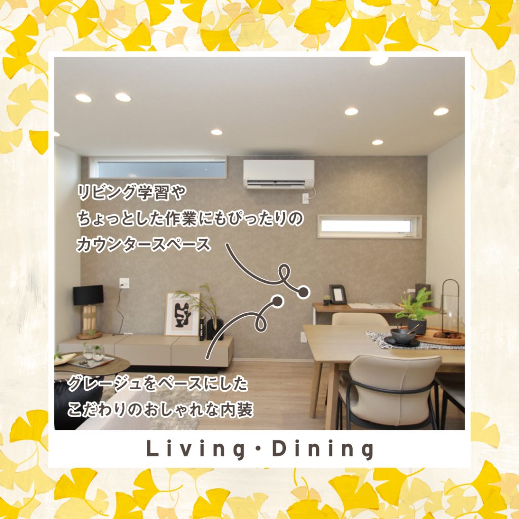 - LDK造作カウンター:リビング学習や在宅ワークに最適。内装はグレージュ基調+アイアン手すり&室内窓で上質に。