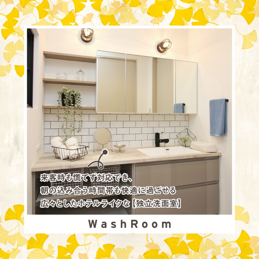 - 独立洗面×脱衣室分離:来客時も慌てず、朝の混み合う時間帯も快適。ホテルライクな広々洗面。