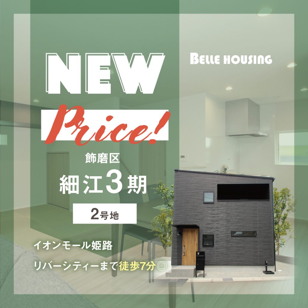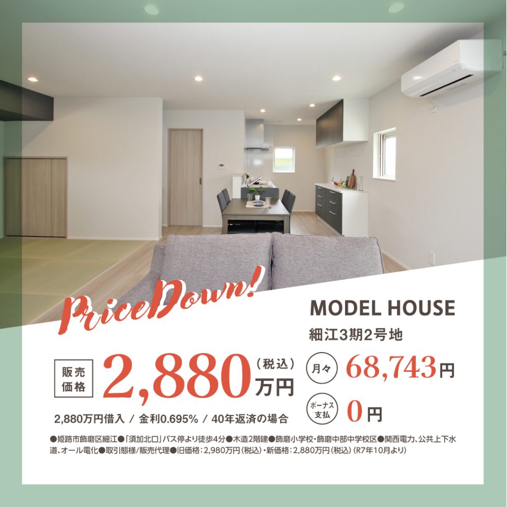 ★NEW PRICEモデルハウス「細江3期2号地」:2,880万円(税込)3LDK、土地面積144.58 ㎡ / 43.74 坪、建物面積144.58 ㎡ / 43.74 坪 ◆イオンモール姫路リバーシティーまで徒歩7分◆2台並列駐車◆学校区:飾磨小学校・飾磨中部中学校