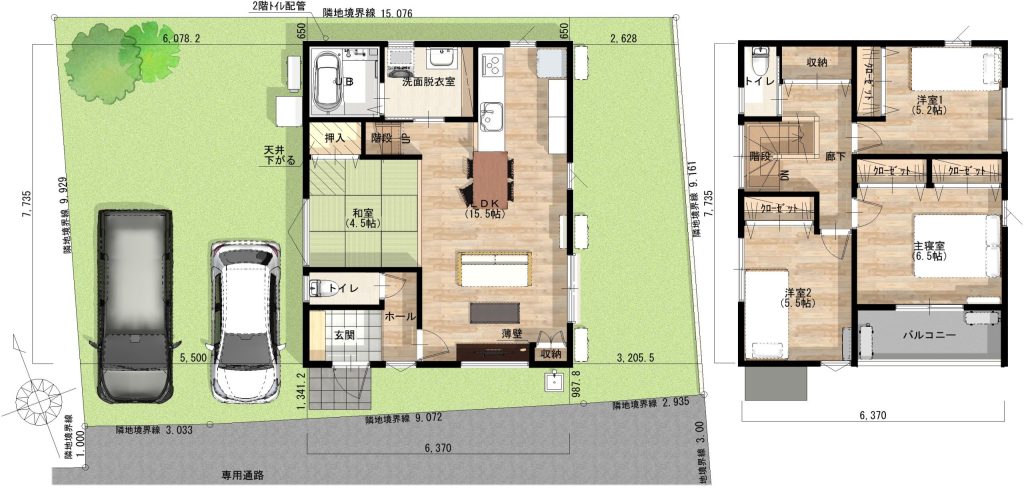 ●庭は2台並列駐車してもゆとりのある広さ。リビング側にも庭があります。