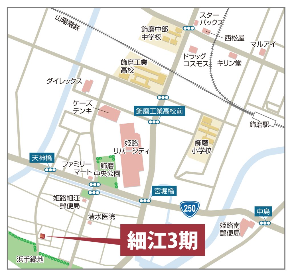 ●イオンモール姫路リバーシティーとファミリーマートまで徒歩7分、ケーズデンキまで徒歩12分、ハローズ姫路市飾磨店まで徒歩13分で買物便利な環境です