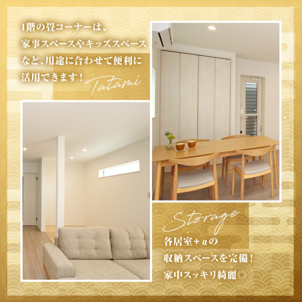 スタイリッシュな住空間に、ウォークインクローゼット、宅配BOX、土間収納、畳スペースなど、皆が欲しい様子を詰め込みました♪
