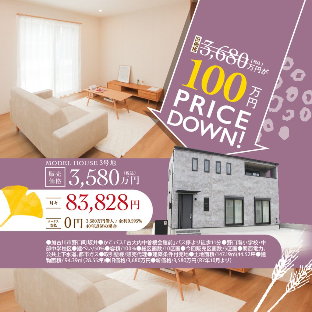 ★PRICE DOWN!加古川市野口町「坂井3号地」見学会ご予約受付中!3,580万円(税込)、3LDK、建物面積94.39 ㎡ / 28.55 坪、土地面積147.19 ㎡ / 44.52 坪◆LDK床暖房◆並列3台駐車 ◆学校区/野口南小学校・中部中学校