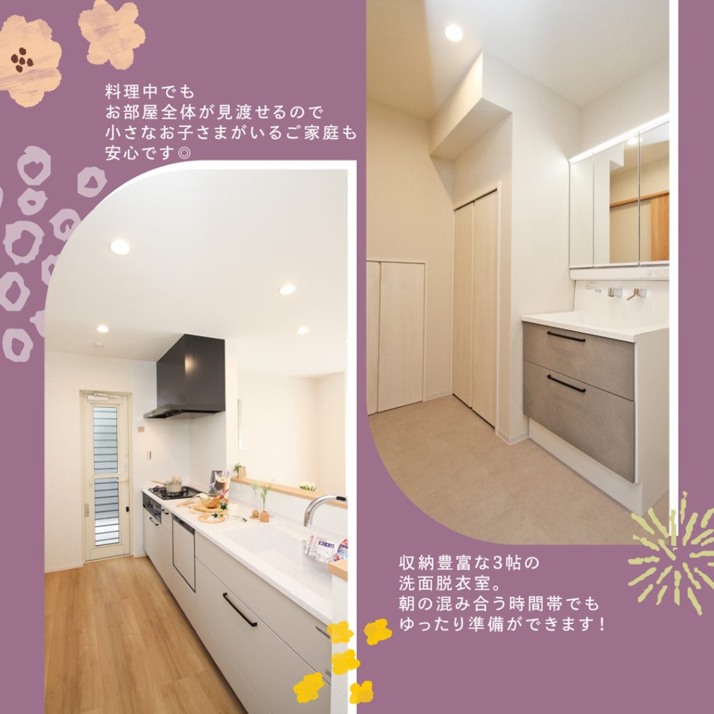 ●3帖の洗面脱衣室は大型収納付き。