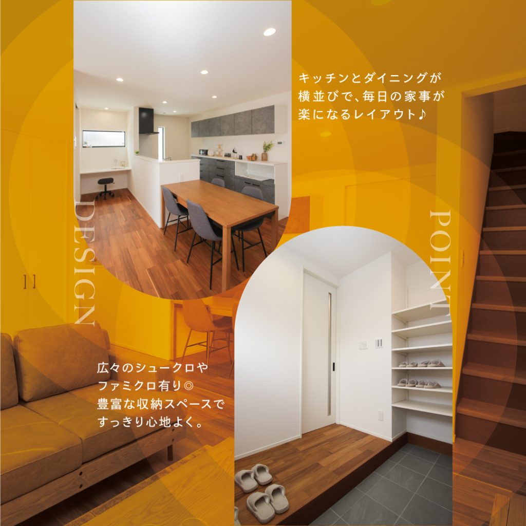 ●➀配膳や食後の片付けがラクなキッチン横並びダイニングテーブル、➁キッチンと水回りが連続している上に、リビング階段を上がってすぐファミクロがある激短家事動線で家事がスムーズに。