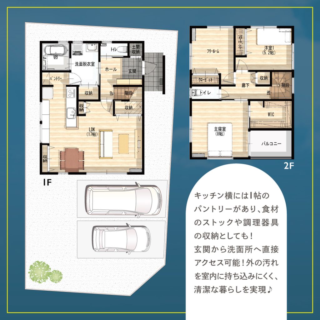 ●キッチン→パントリー→水回り→玄関→LDKを回遊できて家事動線もおかえり動線もスムーズ。