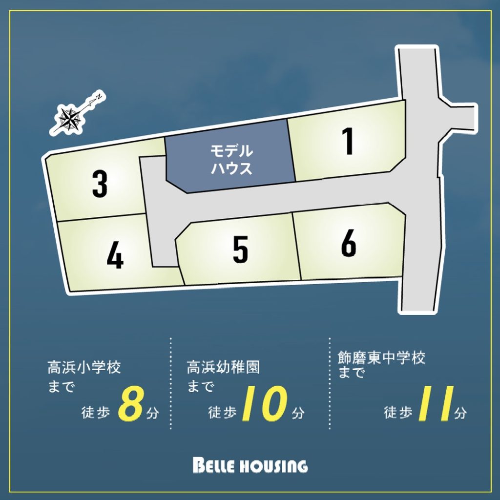 ●高浜幼稚園まで徒歩11分、高浜小学校まで徒歩8分、飾磨東中学校まで徒歩11分。