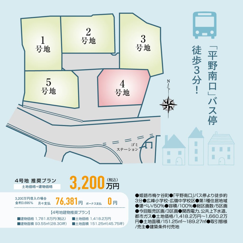 「平野南口」バス停徒歩3分の好立地。ゆったり45坪超の区画で、子育てにやさしい街並みです。