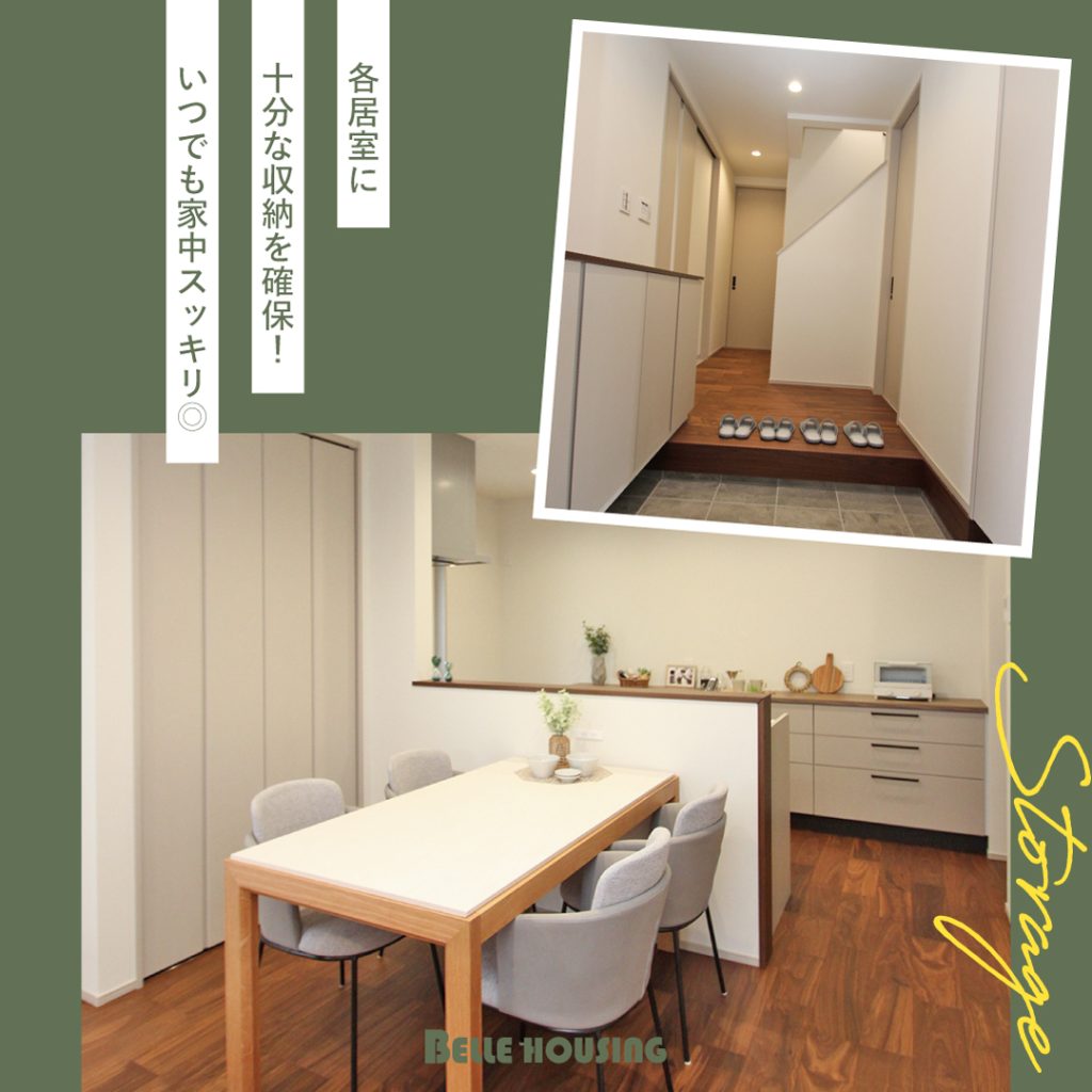 ●玄関まわりには土間収納や階段下収納などがあり、散らかりやすいスペースがスッキリ。