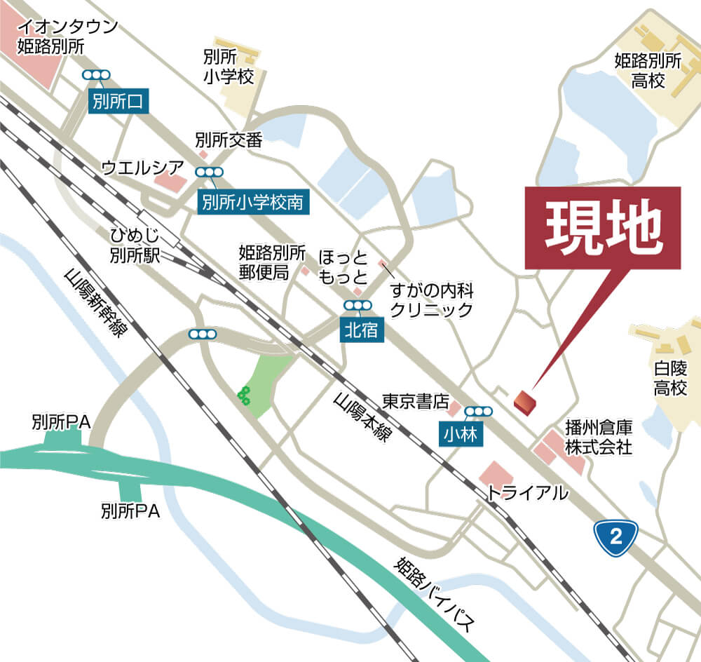 ●JR「ひめじ別所」駅徒歩16分。メイン道路にも近く、電車通勤も車通勤もスムーズです。