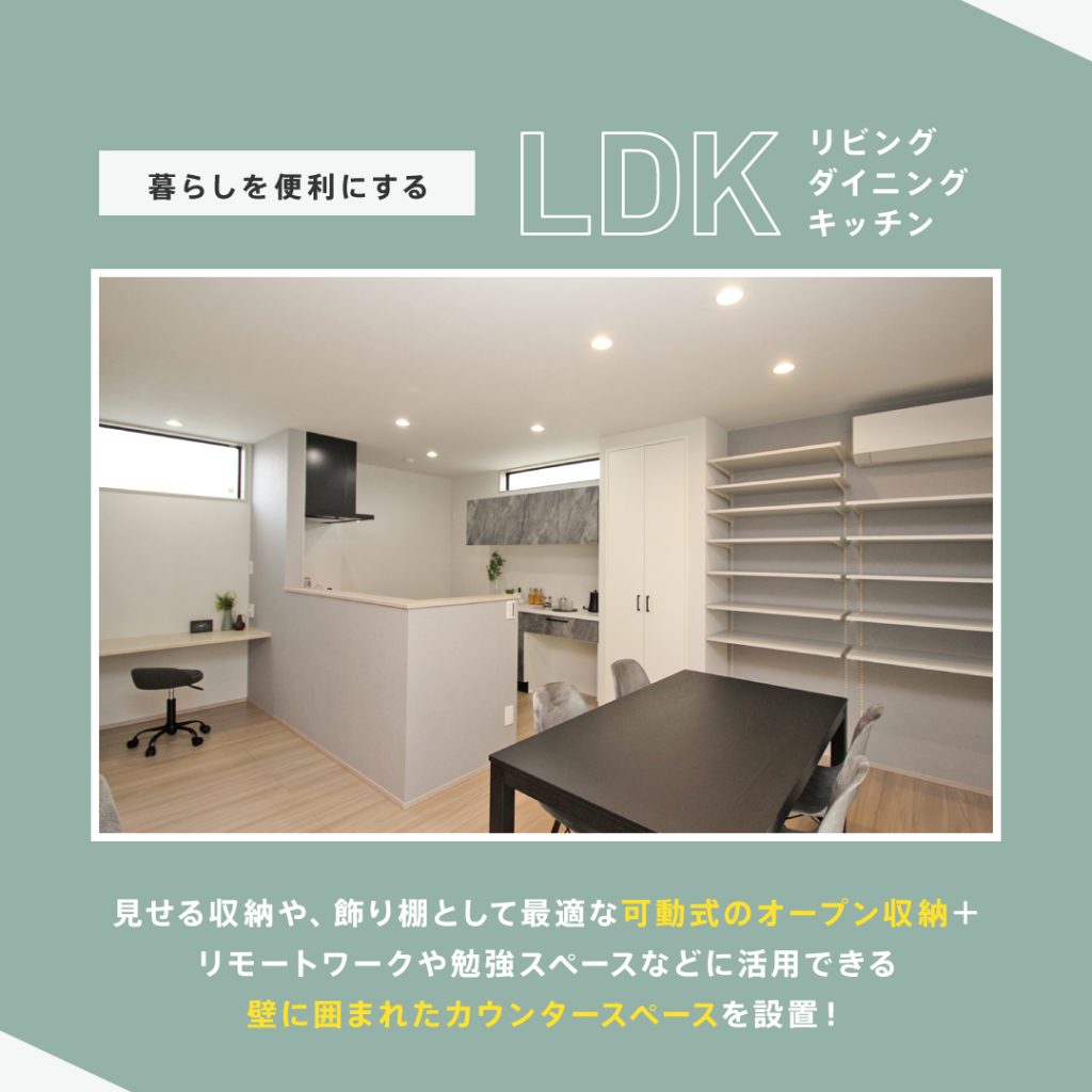 ●LDKにはアクセントウォールを有効活用した可動棚を設置。見せる収納としても、コレクションなどの飾り棚としても大活躍。