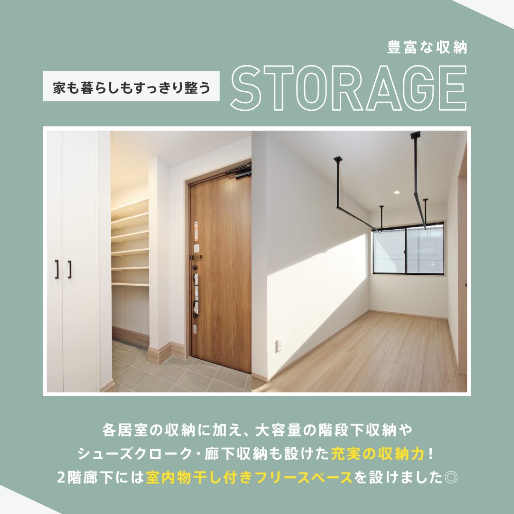 SIC(土間収納)、大型WIC、オープン可動棚など収納充実のお家です。