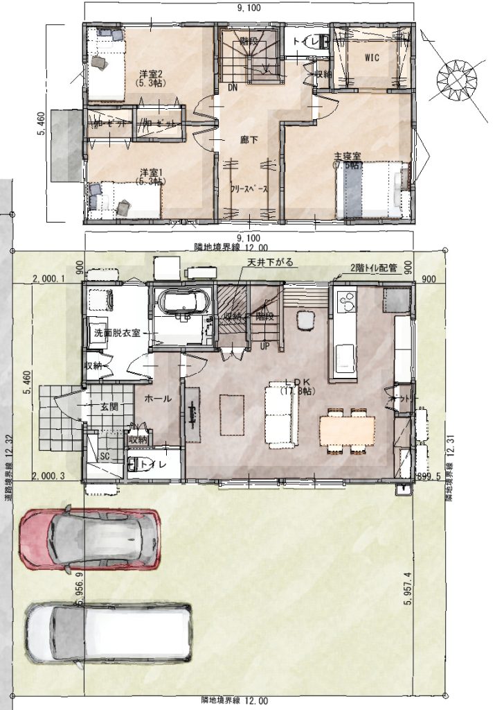●2台並列駐車をしても、まだまだゆとりの庭を確保。