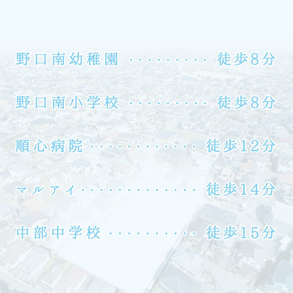 - 野口南幼稚園まで徒歩約9分、野口南小学校まで徒歩約8分、中部中学校まで徒歩約15分