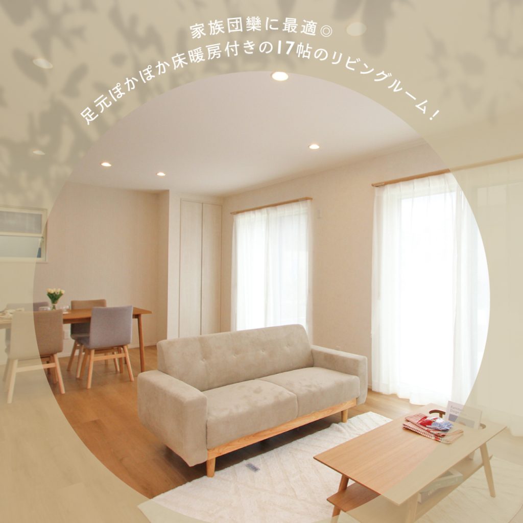 17帖のリビングには床暖房、バスルームには多機能カワックを設置。庭には並列3台駐車が可能で、大家族もゆったり暮らせます。