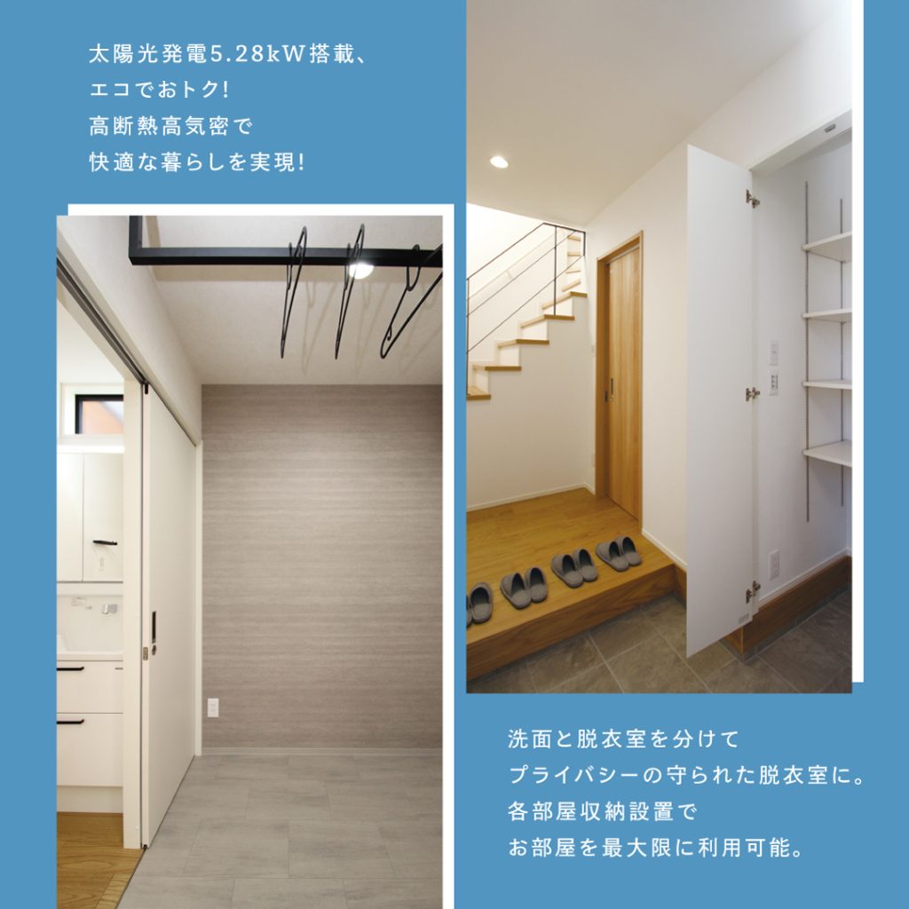 ★太陽光発電パネル5.28kW搭載・加古川市「今福養田4期4号地」モデルハウス完成見学会:3,780万円(税込)3LDK、土地面積145.18 ㎡ / 43.91 坪、建物面積100.52 ㎡ / 30.4 坪◆GX志向型住宅◆脱衣室兼物干スペース◆3台駐車◆学校区:若宮小学校・浜の宮中学校