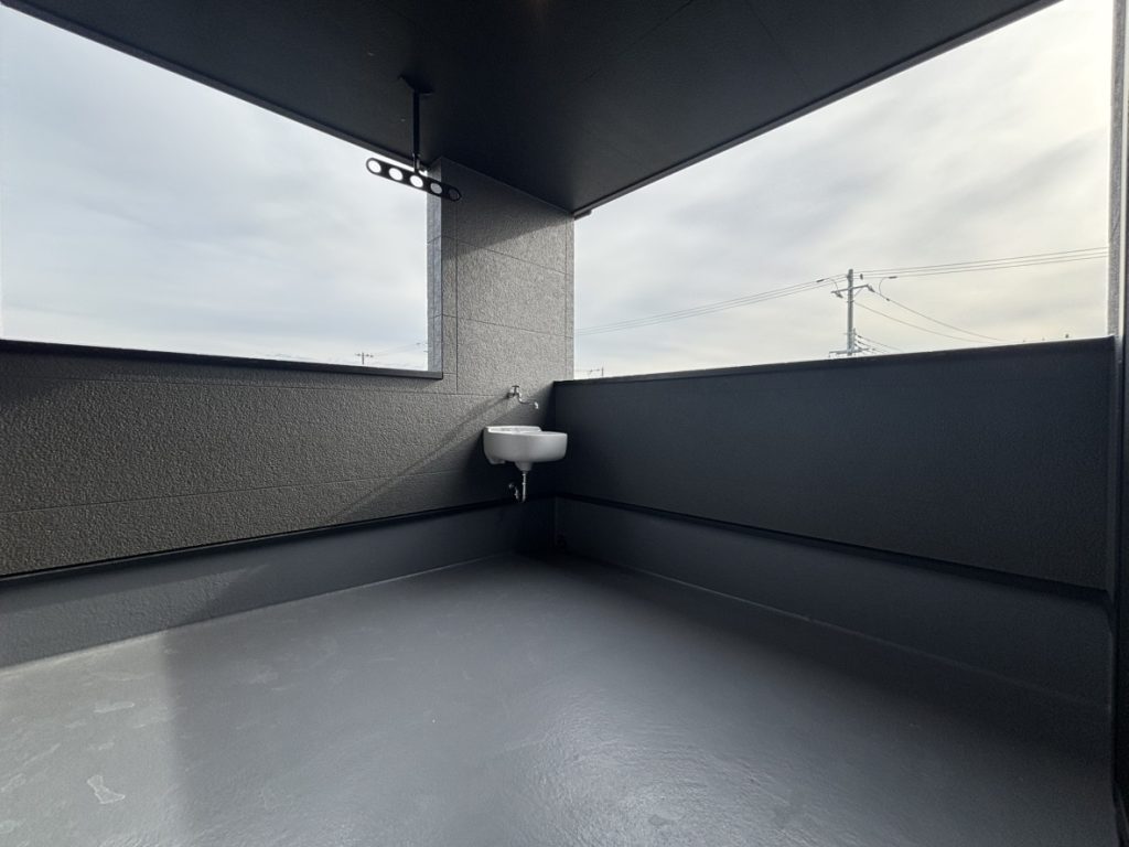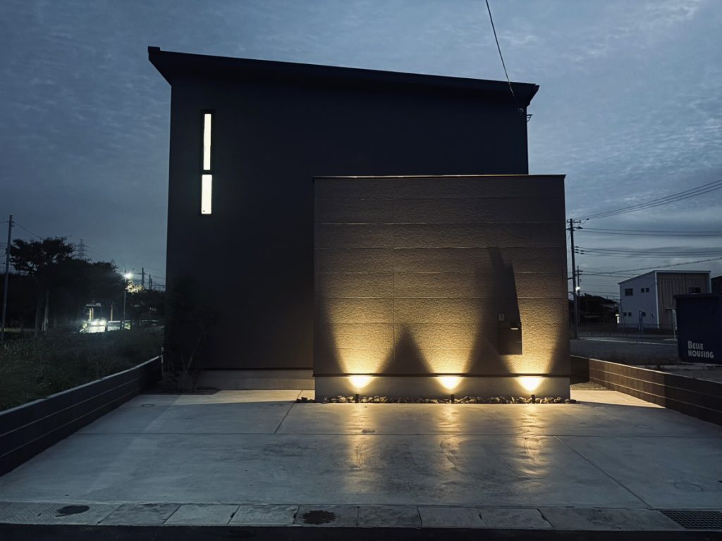 ●プライバシーに配慮し、玄関前に目隠し壁を施工。雨風を軽減できるだけでなく、外遊びの道具や自転車などの置き場としても◎
