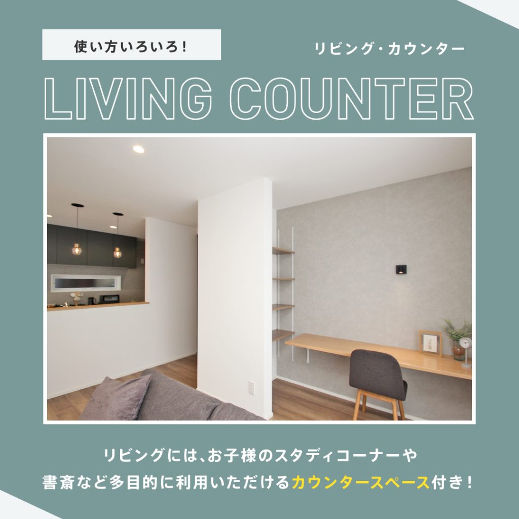●リビングにはロングカウンターのワークスペースを配置。収納や専用の照明も完備しています。家事をしながら見守れるスタディスペースや、テレワークのワークスペースに。