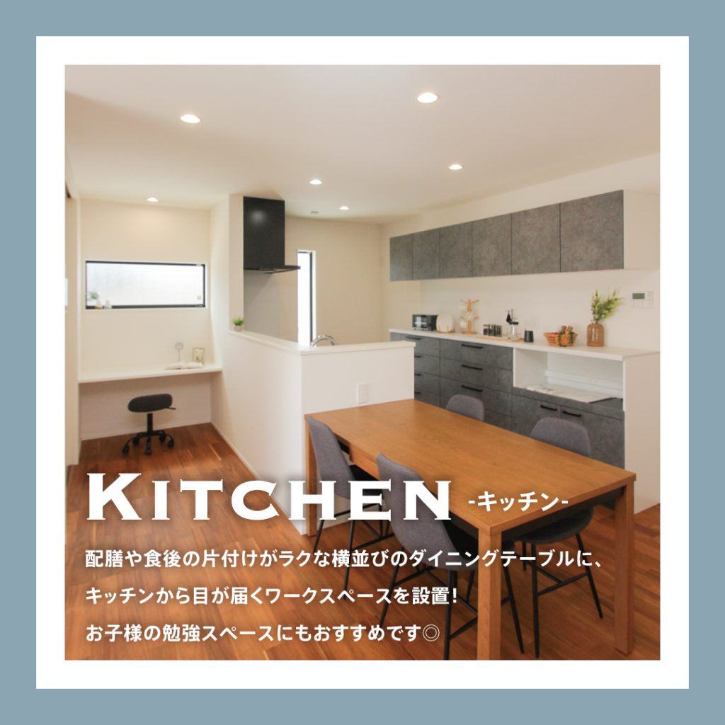 室内には木目が美しい 突板アカシアフローリング を採用し、自然素材の温かみが日常の空間に溶け込みます。キッチンとダイニングが横並びで配されたレイアウトは、家事動線がスムーズで日々の使い勝手も快適です。