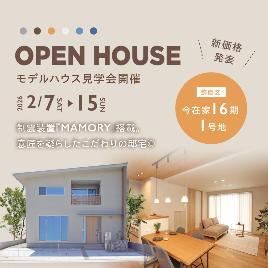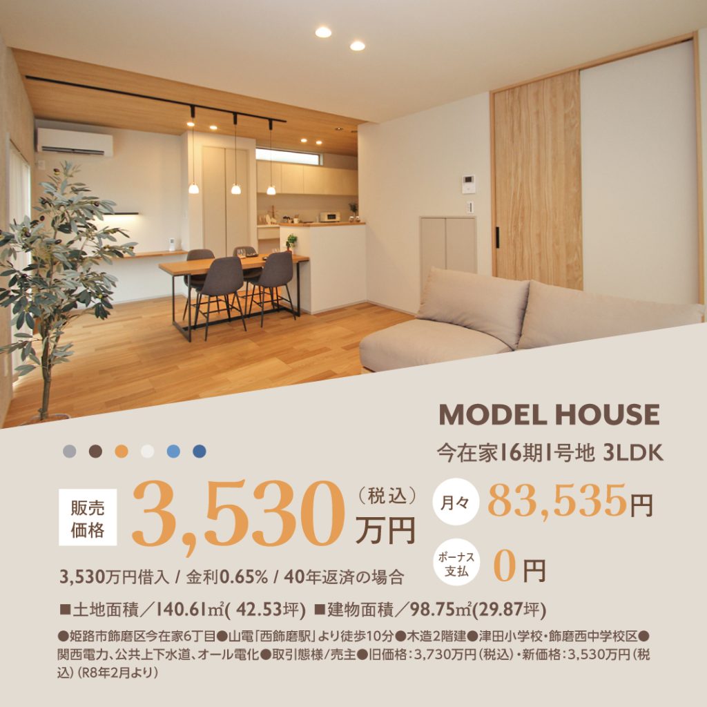 姫路市今在家の住宅地に登場した、BELLE HOUSING の 今在家16期1号地モデルハウス。