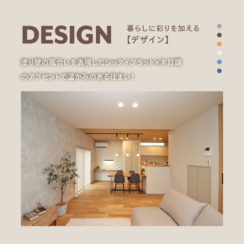 外観は塗り壁の風合いをリアルに表現したシックイフラット仕上げに、木目調のアクセントが温かみを添えるデザインです。落ち着いた色調が街並みに上質な印象をもたらします。