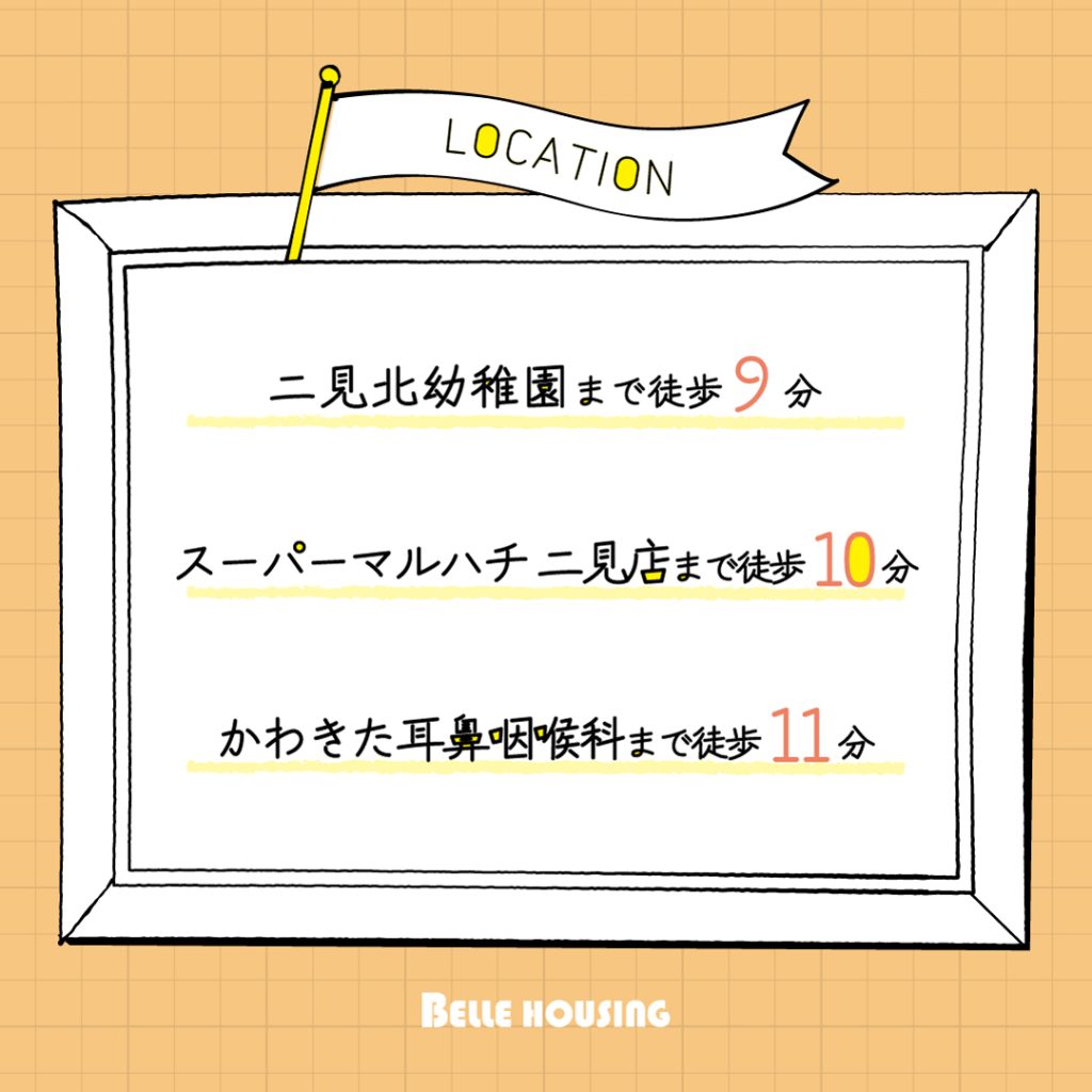 徒歩圏内には 小学校が約7分 と通学も安心。周辺には病院やスーパー、公園など生活施設も整っており、毎日の生活が快適に過ごせる環境が整っています。公共交通機関はJR「土山」駅や山電「東二見」駅が利用可能で、通勤・通学やお出かけにも便利なアクセスです。