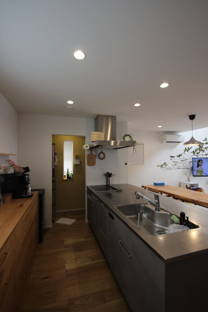 オーダーメイドの木製カップボードを配置したキッチン。システムキッチンのフルフラットカウンターとワークトップの高さを揃え、見た目も使い勝手も良好です。キッチン横にはウォークインパントリーを配置しました。
